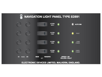 The ED891 is a navigation light control and monitoring panel which can be provided to suit individual boat and ship requirements. Operating from a Main and Emergency 24Vdc supply, with automatic changeover, the ED891 provides switching for both four main and four reserve lamps.